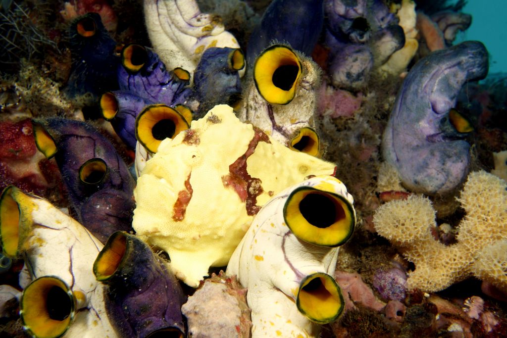 Frogfish hiding in seasquirts (by Pephanek)