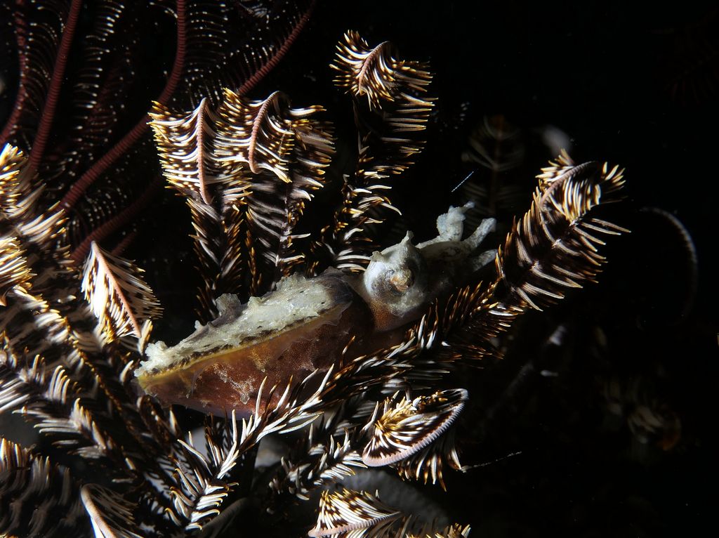Cuttle fish se schovává ve feather star